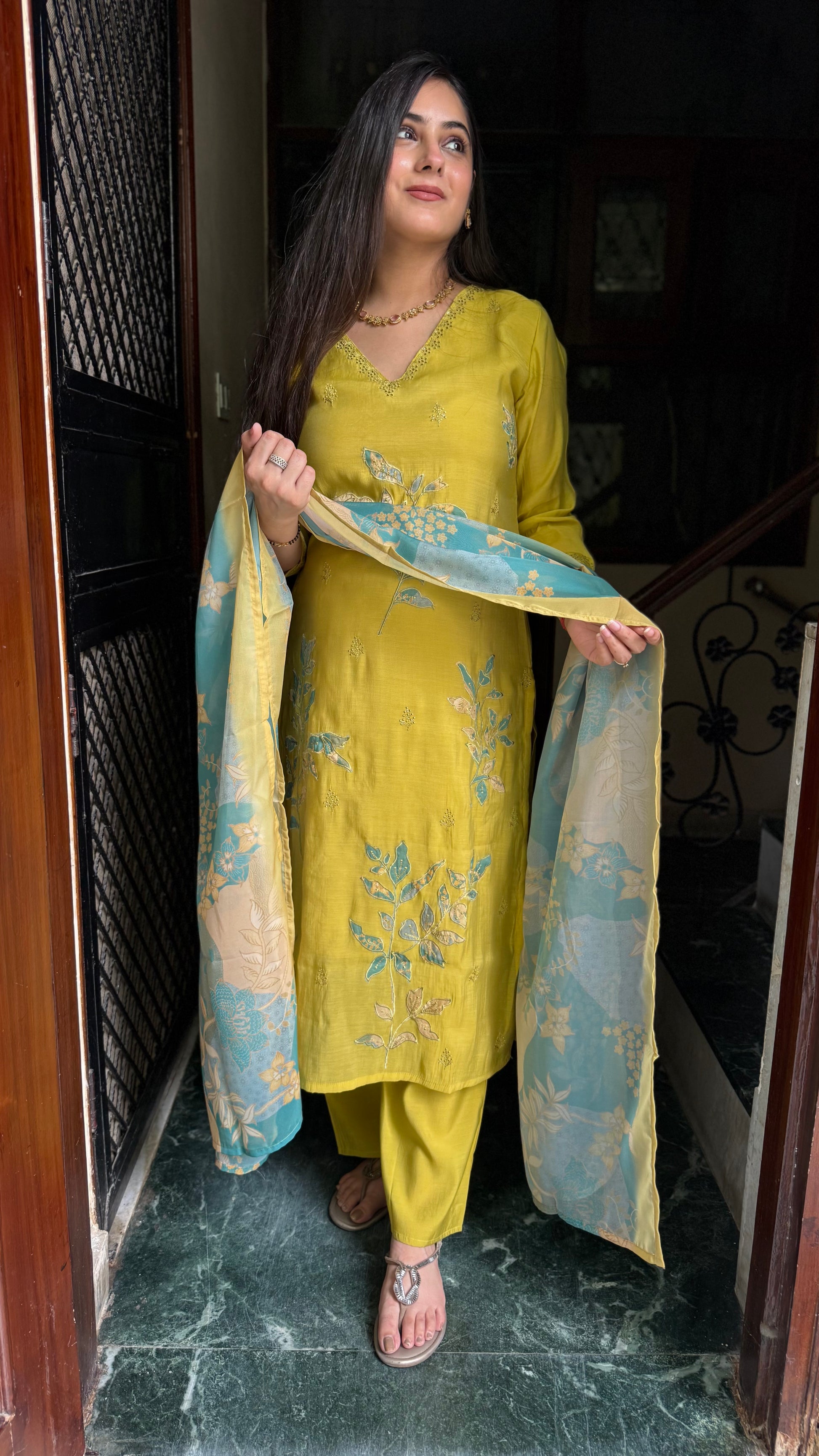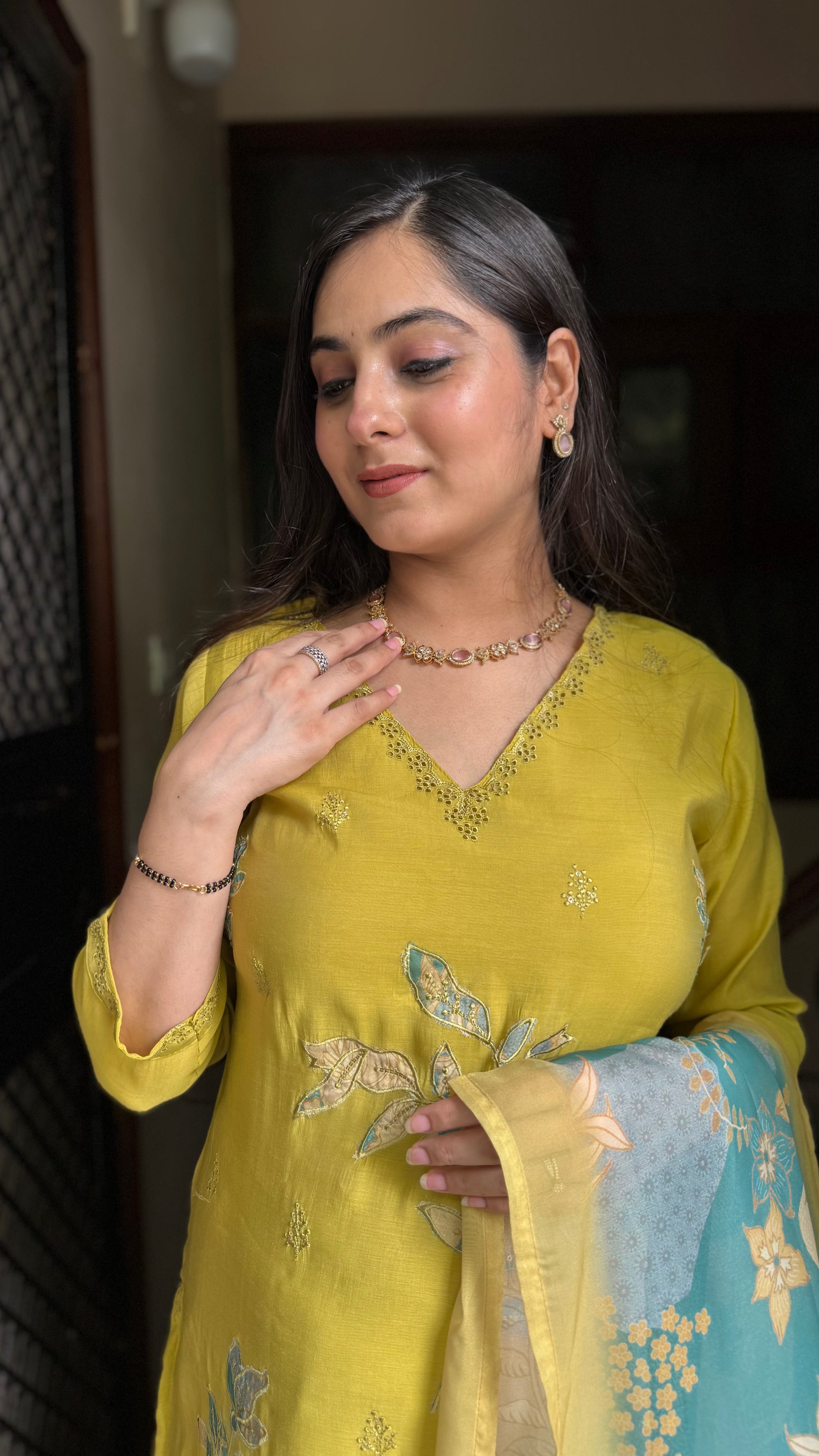 Feminine, graceful, and perfect for YOU! Our Mustard Mul Chanderi Suit with embroidered sleeves comes in chanderi fabric with cotton lining along with chanderi dupatta.