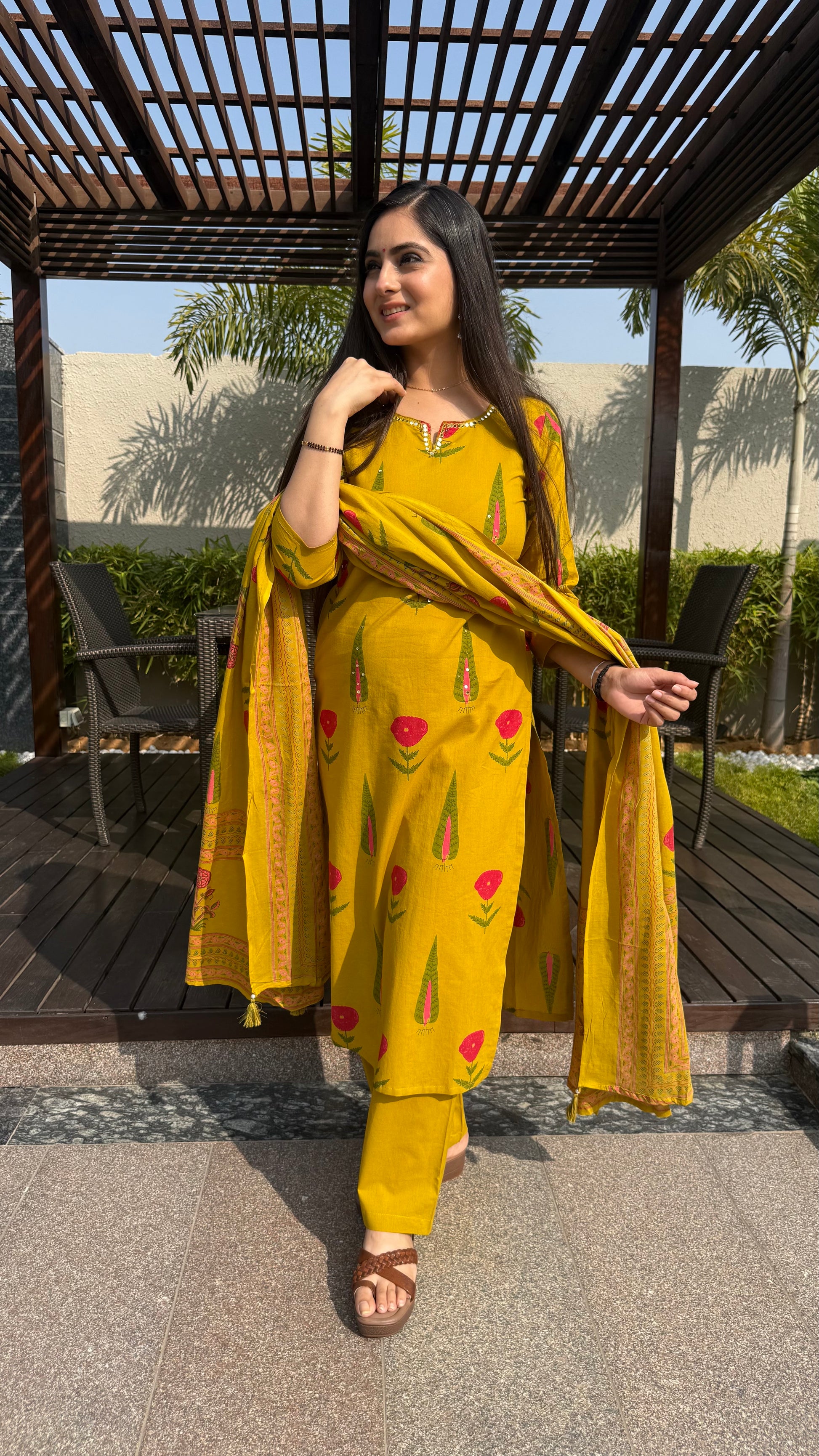 Swing through the Spring days with this elegant Mustard Cotton Suit Set. This beautiful cotton suit set showcases a refined floral printed pattern against a pleasing colour tone. Get ready to glow a little more with this must-have cotton suit set.