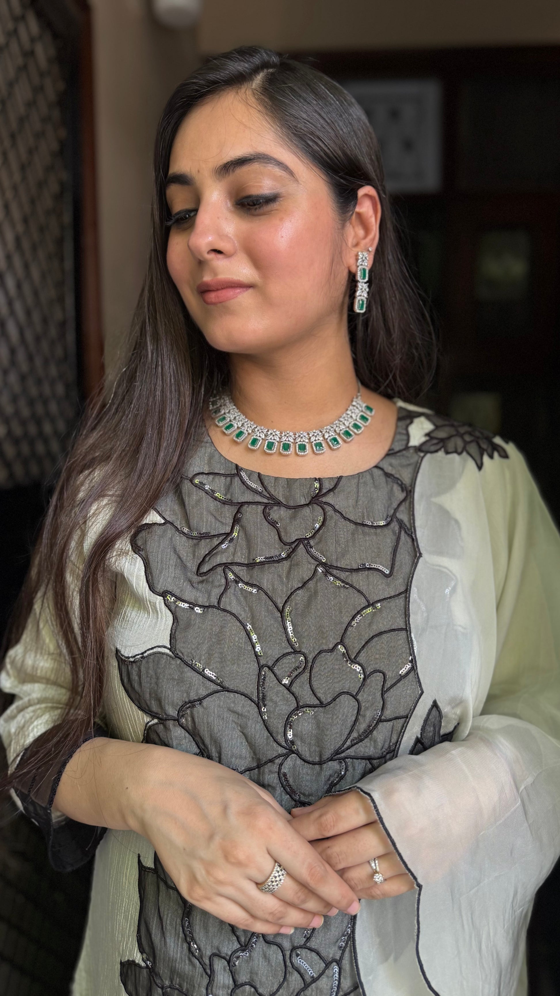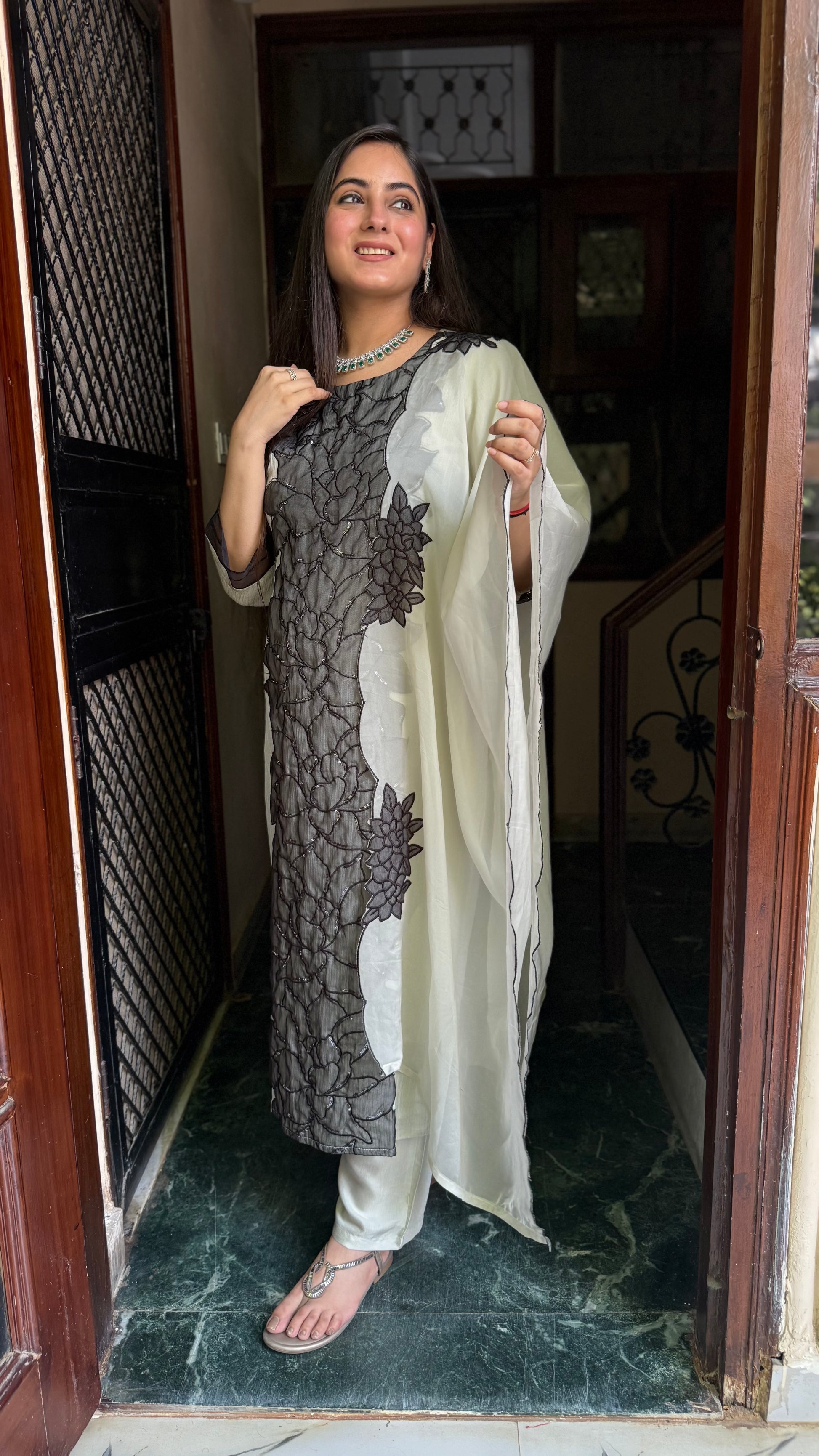 Slay in style all day long with this Grey Glass Tissue  Suit Set. The classic embroidery on Tissue Kurti makes it an absolute stunner.  Featuring hand embroidered kurta, pant and a beautiful Organza dupatta, it’s a wardrobe essential.