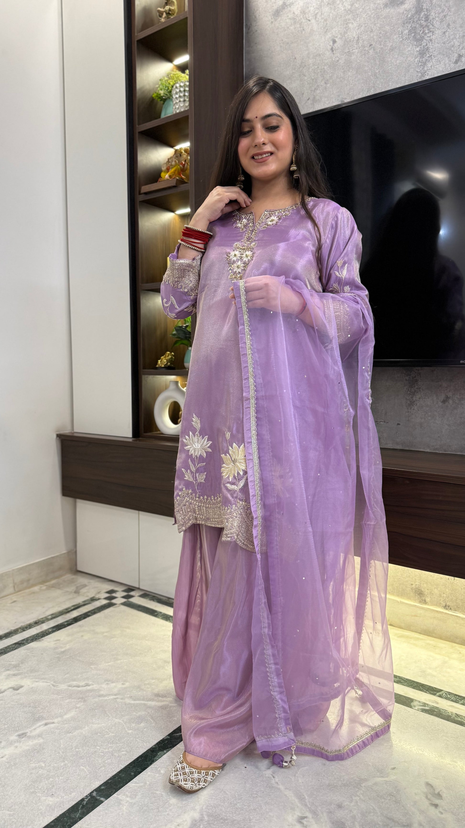 Slay in style all day long with this Lilac Tissue  Suit Set. The classic embroidery on Tissue Kurti makes it an absolute stunner.  Featuring hand embroidered kurta, pant and a beautiful Organza dupatta, it’s a wardrobe essential.
