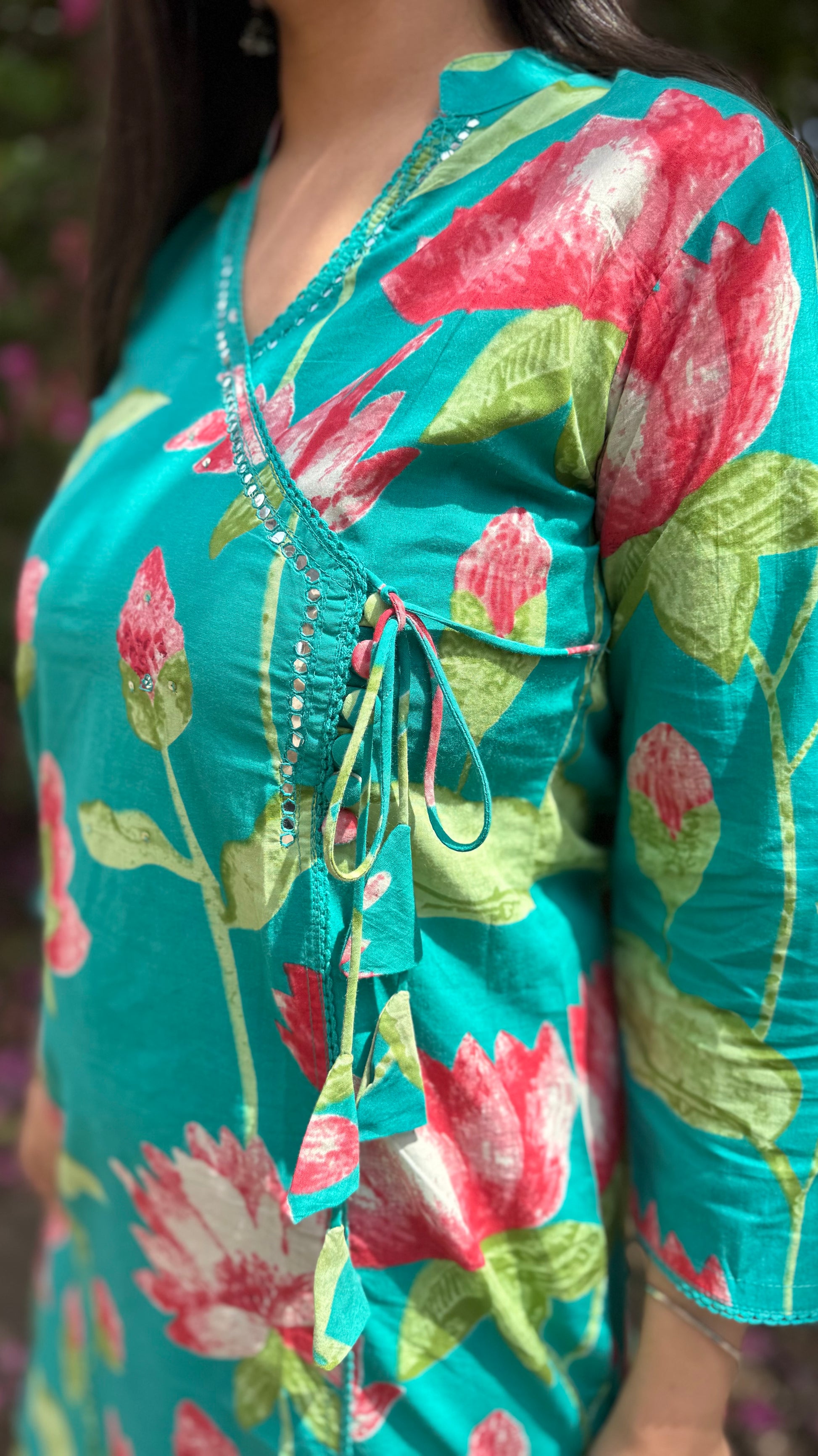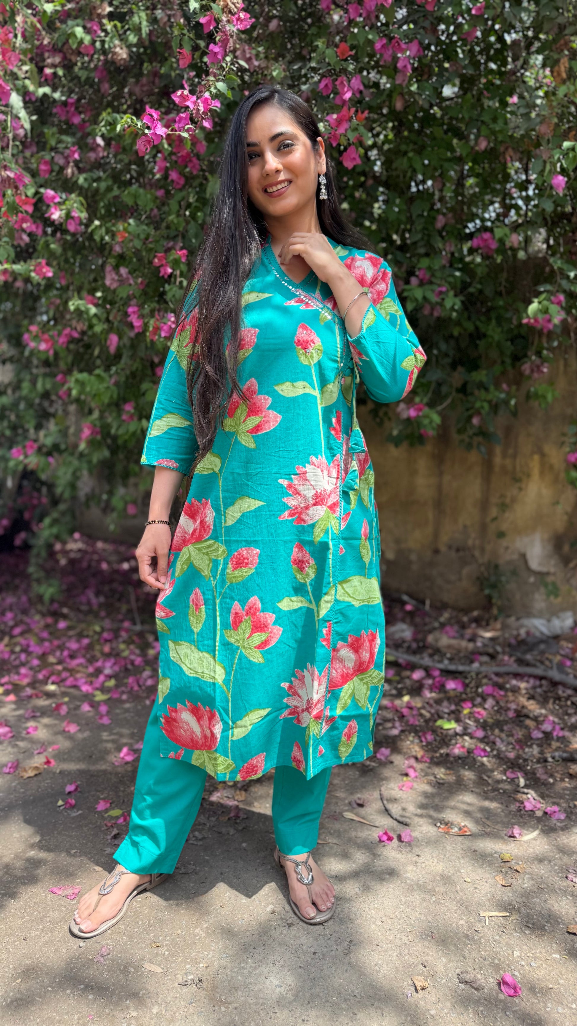 Crafted with perfect summer fabrics this coord set exudes regality and how! With happy florals, Cotton loose fit kurta and Pant, this coord set accentuates opulent enchantments.