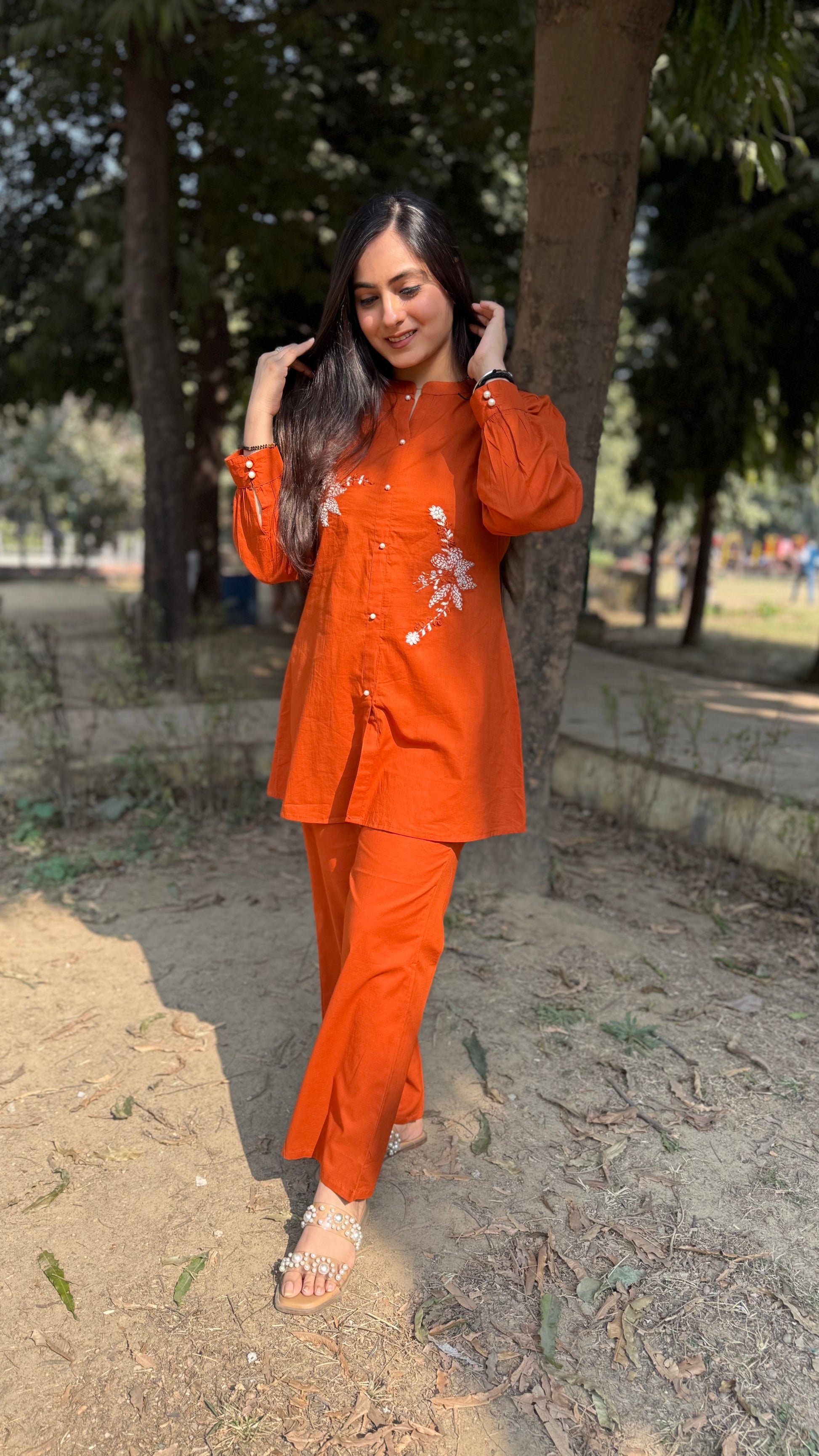 Orange Coord Set in magical hues of Orange are chic, comfortable, and perfect for  Festive vibes! The set features a Orange Shirt kurta with embroidery. Complimenting the kurta, the pants come with same colour.
